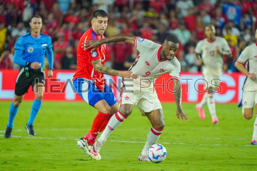 Orlando, Florida, USA, June 20, 2024, Canada forward Cyle Larin #9 runs up field as he receives pressure from Guillermo Maripán #3 during the 2024 Copa America at Inter&Co Stadium. (Photo Credit: Marty Jean-Louis)