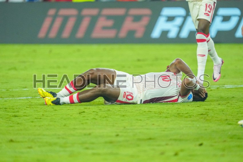 Orlando, Florida, USA, June 20, 2024, Canada's Alphonso Davies #19 on the floor after clash during the 2024 Copa America at Inter&Co Stadium. (Photo Credit: Marty Jean-Louis)