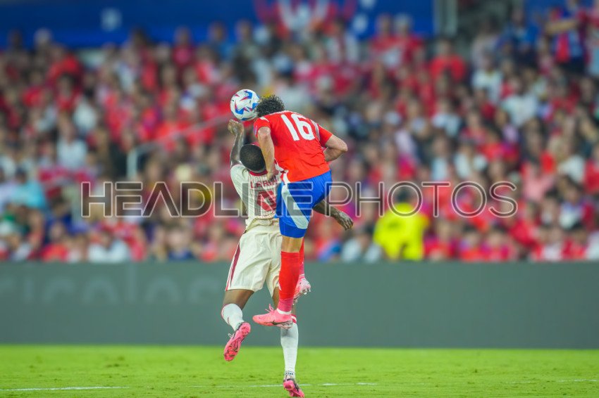 Orlando, Florida, USA, June 20, 2024, Chile player Igor Lichnovsky #16 wins the header during the 2024 Copa America at Inter&Co Stadium. (Photo Credit: Marty Jean-Louis)