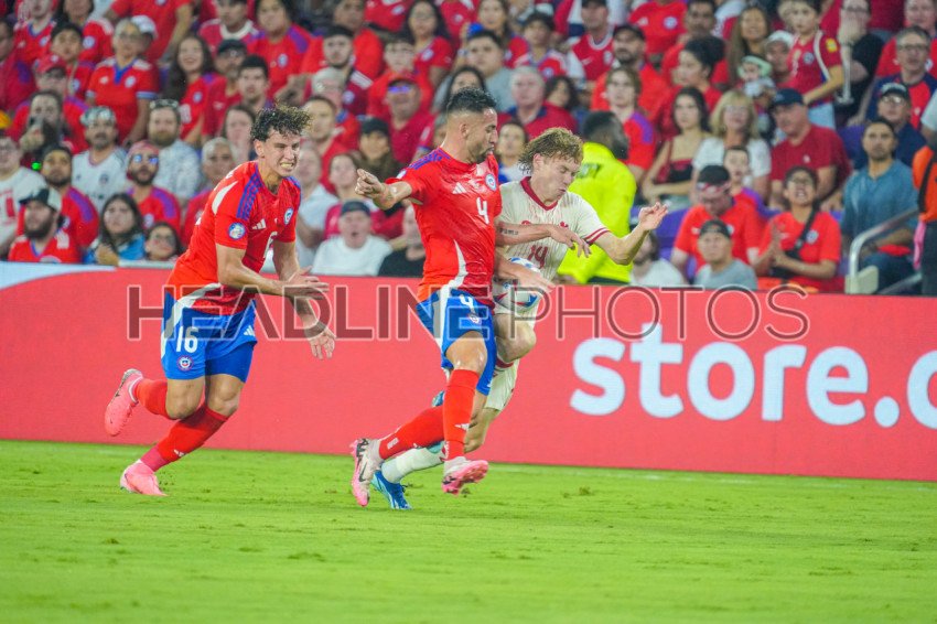Orlando, Florida, USA, June 20, 2024, Canada player Jacob Shaffelburg #14 runs after a pass as Mauricio Isla #4 attempt to steal during the 2024 Copa America at Inter&Co Stadium. (Photo Credit: Marty Jean-Louis)