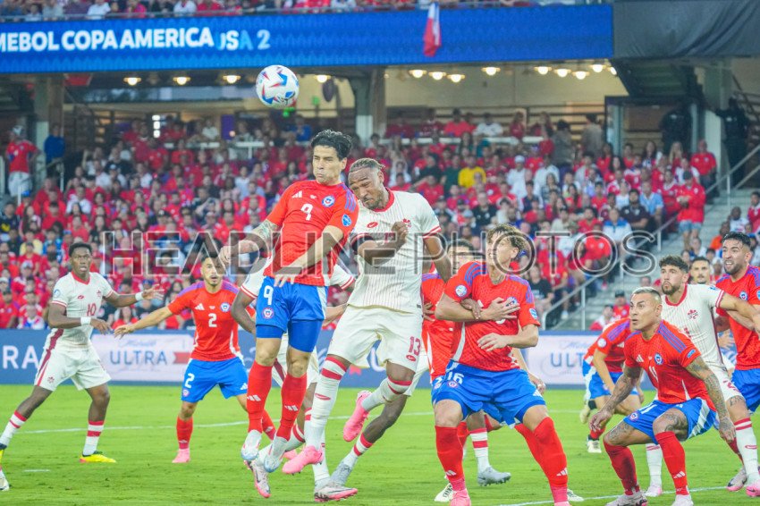 Orlando, Florida, USA, June 20, 2024, Chile defender Víctor Dávila #9 wins the header during the 2024 Copa America at Inter&Co Stadium. (Photo Credit: Marty Jean-Louis)
