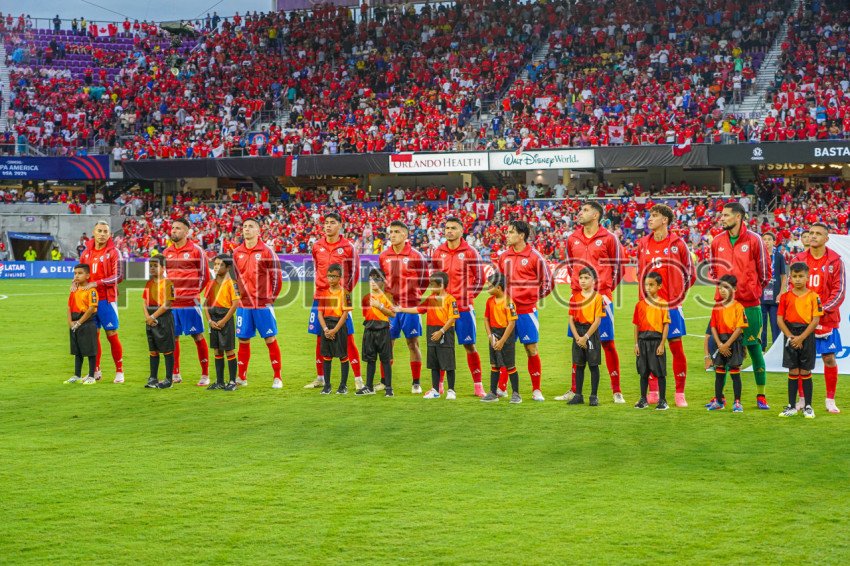 Orlando, Florida, USA, June 20, 2024, Chile players stand for the National Anthems during the 2024 Copa America at Inter&Co Stadium. (Photo Credit: Marty Jean-Louis)