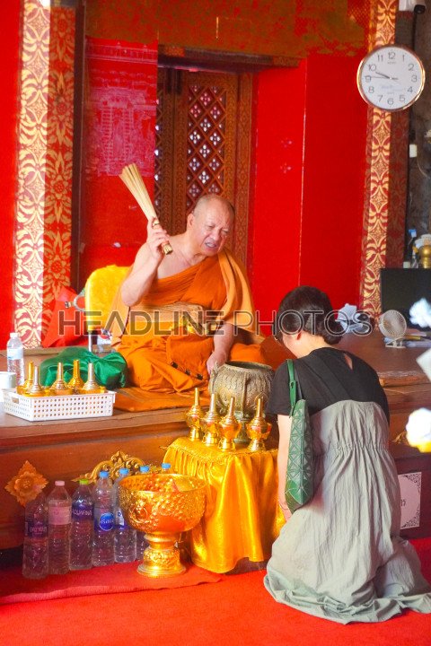 Woman kneeling in fron tof a monk at The gold Temple in Wat Prathat Doi Suthep, Thailand
