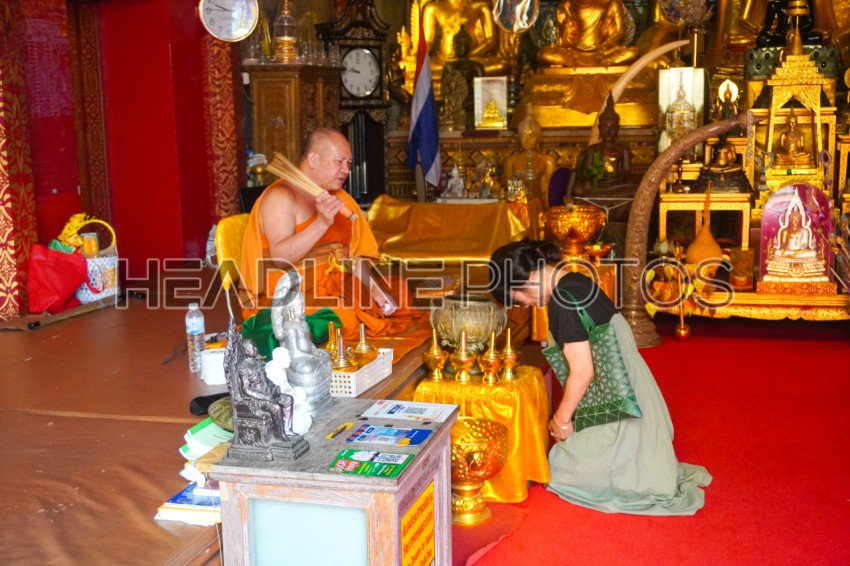 Woman kneeling in fron tof a monk at The gold Temple in Wat Prathat Doi Suthep, Thailand