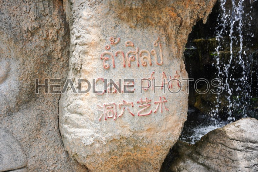 Waterfall at Cave of the arts at the white Temple in WatRong Khun, Thailand
