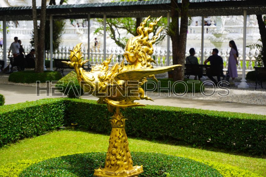 Golden fish-like statue at the white Temple in WatRong Khun, Thailand