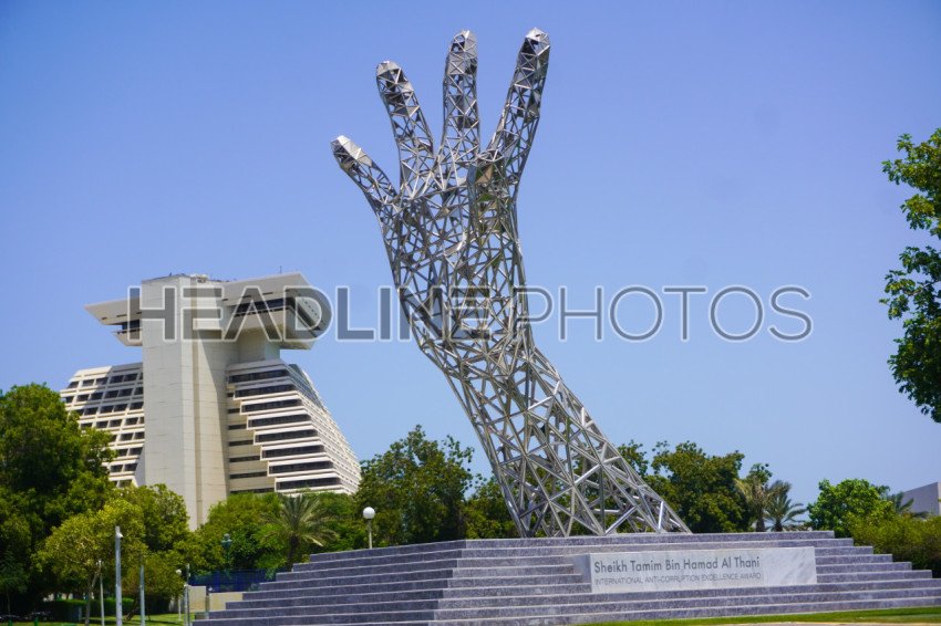 Sculpture for the Sheikh Tamim Bin Hamad Al Thani International Anti-Corruption Excellence Award at a park close to Sheraton Hotel on Doha's corniche In Doha, Qatar