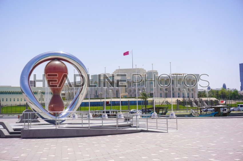 The view of Amiri Diwan government complex from the Corniche in Doha, Qatar