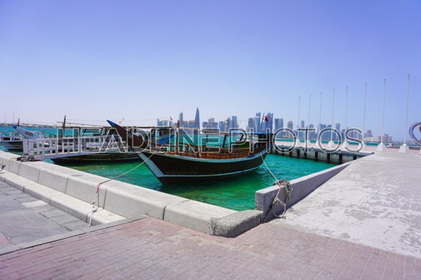 Old wooden boats dhows with Qatari flags in Doha Harbor and City Skyline in Distance