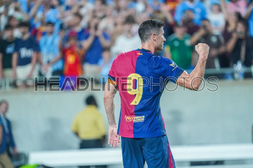 Orlando, Florida, USA, July 30, 2024, FC Barcelona forward Robert Lewandowski #9 reacts after making the penalty during the 2024 FC Series at Camping World Stadium. (Photo Credit: Marty Jean-Louis)
