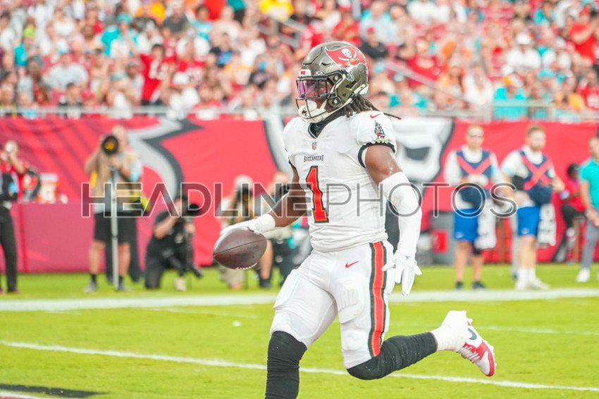 Tampa Bay, Florida, USA, August 33, 2024, Tampa Bay Buccaneers player Rachaad White #1 makes a touchdown at Raymond James Stadium. (Photo Credit: Marty Jean-Louis)