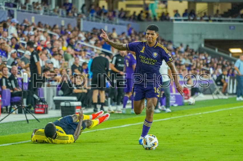 Orlando, Florida, USA, August 31, 2024, Orlando City's Wilder Cartagena #16 shakes his finger to suggest no foul at Exploria Stadium (Photo Credit: Marty Jean-Louis)