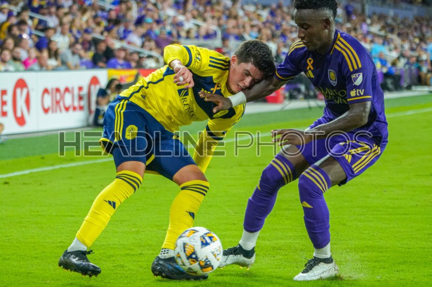 Orlando, Florida, USA, August 31, 2024, Nashville SC player Jonathan Perez #24 and Orlando's Ivan Angulo #77 fight for the ball at Exploria Stadium (Photo Credit: Marty Jean-Louis)