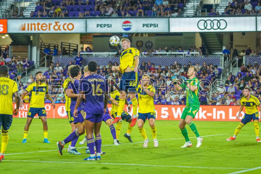 Orlando, Florida, USA, August 31, 2024, Nashville SC player Josh Bauer #22 devends the ball with a header at Exploria Stadium (Photo Credit: Marty Jean-Louis)