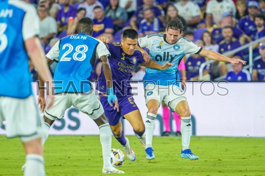 Orlando, Florida, USA, September 18, 2024, Orlando City SC player César Araújo #5 attempt to run pass Charlotte players in the first half at Inter&Co Stadium. (Photo Credit: Marty Jean-Louis)