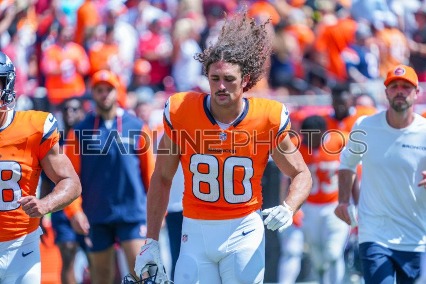 Tampa Bay, Florida, USA, September 22, 2024, Denver Broncos player Greg Dulcich #80 at Raymond James Stadium. (Photo Credit: Marty Jean-Louis)