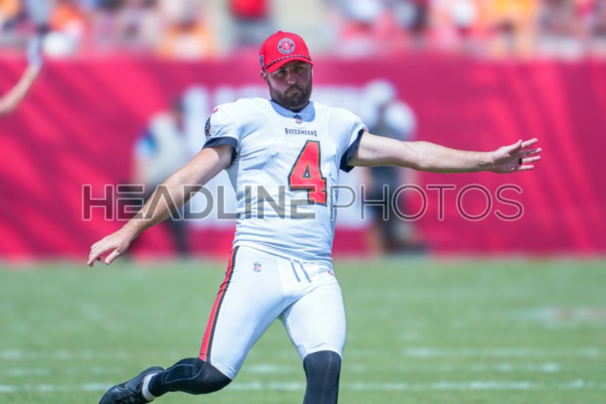 Tampa Bay, Florida, USA, September 22, 2024, Tampa Bay Buccaneers kicker Chase McLaughlin #4 warming up at Raymond James Stadium. (Photo Credit: Marty Jean-Louis)
