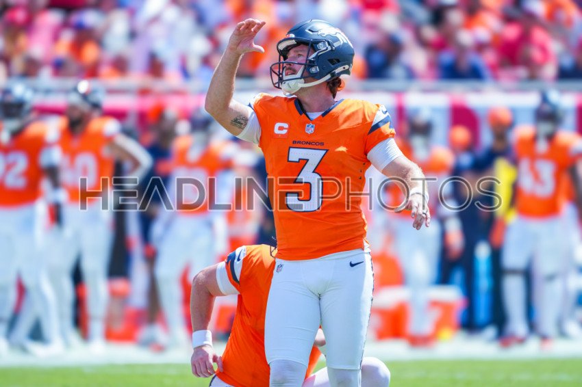 Tampa Bay, Florida, USA, September 22, 2024, Denver Broncos kicker Wil Lutz #3 makes a kick at Raymond James Stadium. (Photo Credit: Marty Jean-Louis)