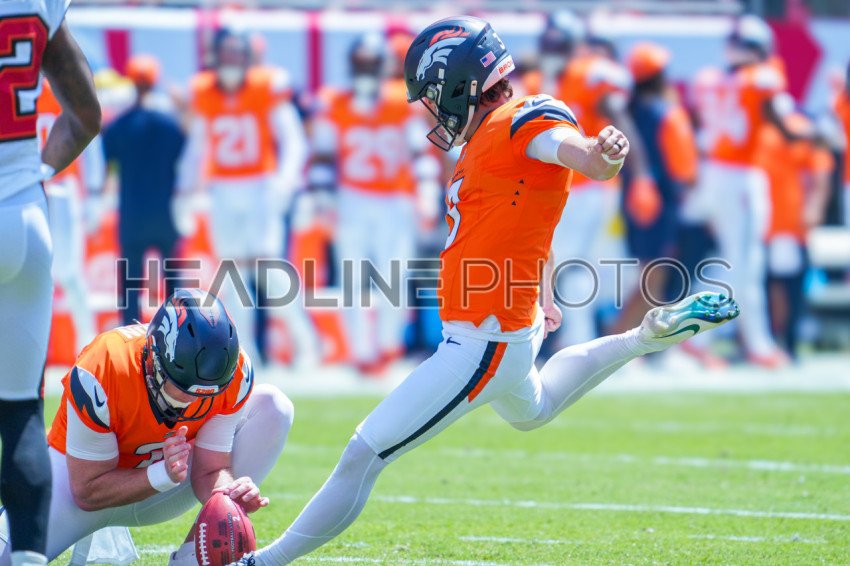 Tampa Bay, Florida, USA, September 22, 2024, Denver Broncos kicker Wil Lutz #3 makes a kick at Raymond James Stadium. (Photo Credit: Marty Jean-Louis)