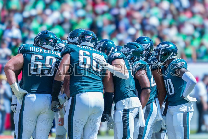 Tampa Bay, Florida, USA, September 29, 2024, Philadelphia Eagles players huddle at Raymond James Stadium. (Photo Credit: Marty Jean-Louis)