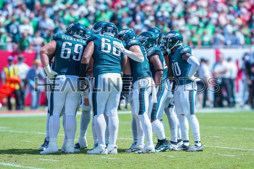 Tampa Bay, Florida, USA, September 29, 2024, Philadelphia Eagles players huddle at Raymond James Stadium. (Photo Credit: Marty Jean-Louis)