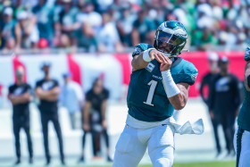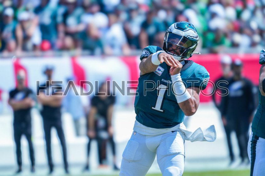 Tampa Bay, Florida, USA, September 29, 2024, Philadelphia Eagles quarterback Jalen Hurts #1 makes a pass at Raymond James Stadium. (Photo Credit: Marty Jean-Louis)