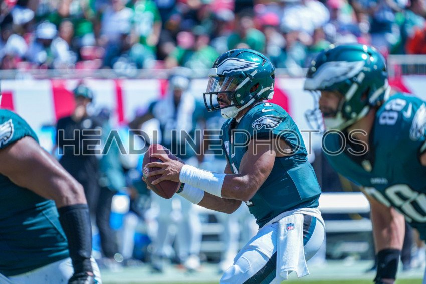 Tampa Bay, Florida, USA, September 29, 2024, Philadelphia Eagles quarterback Jalen Hurts #1 readies to makes a pass at Raymond James Stadium. (Photo Credit: Marty Jean-Louis)