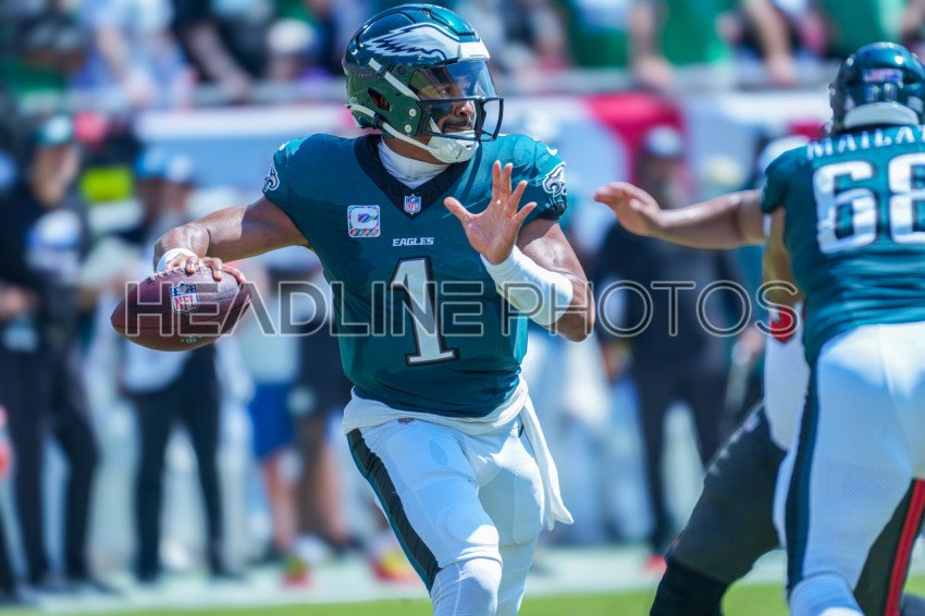 Tampa Bay, Florida, USA, September 29, 2024, Philadelphia Eagles quarterback Jalen Hurts #1 readies to make a pass at Raymond James Stadium. (Photo Credit: Marty Jean-Louis)