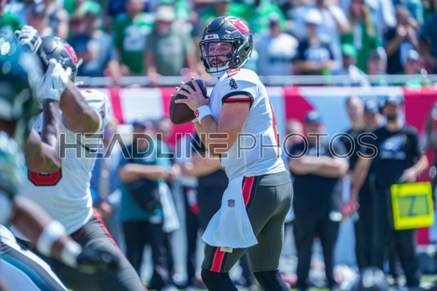 Tampa Bay, Florida, USA, September 29, 2024, Tampa Bay Buccaneers quarterback Baker Mayfield #6 readies to make a pass at Raymond James Stadium. (Photo Credit: Marty Jean-Louis)