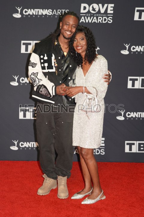 Nashville, Tennessee, USA, October 1, 2024. Rapper KB with his mom At the Red carpet during the 55th Annual GMA Dove Awards at Lipscomb University Allen Arena (Photo Credit: Marty Jean-Louis)