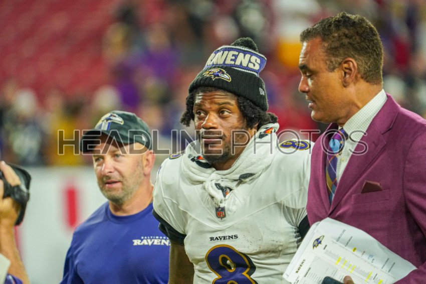 Tampa Bay, Florida, USA, October 21, 2024, Baltimore Ravens quarterback Lamar Jackson #8 leaves the field after a win at Raymond James Stadium. (Photo Credit: Marty Jean-Louis)