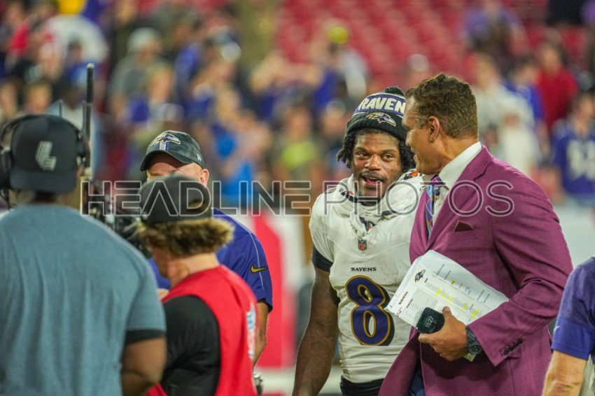 Tampa Bay, Florida, USA, October 21, 2024, Baltimore Ravens quarterback Lamar Jackson #8 leaves the field after a win at Raymond James Stadium. (Photo Credit: Marty Jean-Louis)