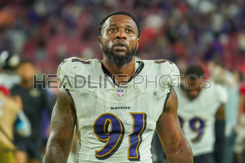 Tampa Bay, Florida, USA, October 21, 2024, Baltimore Ravens player Yannick Ngakoue #91 at Raymond James Stadium. (Photo Credit: Marty Jean-Louis)
