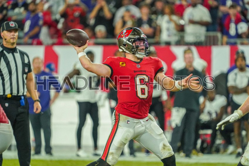 Tampa Bay, Florida, USA, October 21, 2024, Tampa Bay Buccaneers player Baker Mayfield #6 makes a pass at Raymond James Stadium. (Photo Credit: Marty Jean-Louis)