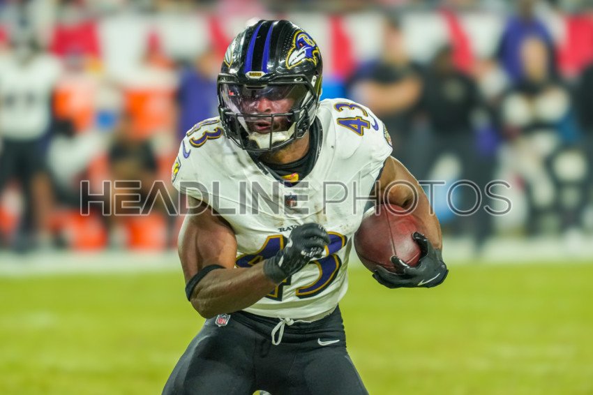 Tampa Bay, Florida, USA, October 21, 2024, Baltimore Ravens runnigback Justice Hill #43 makes a run at Raymond James Stadium. (Photo Credit: Marty Jean-Louis)