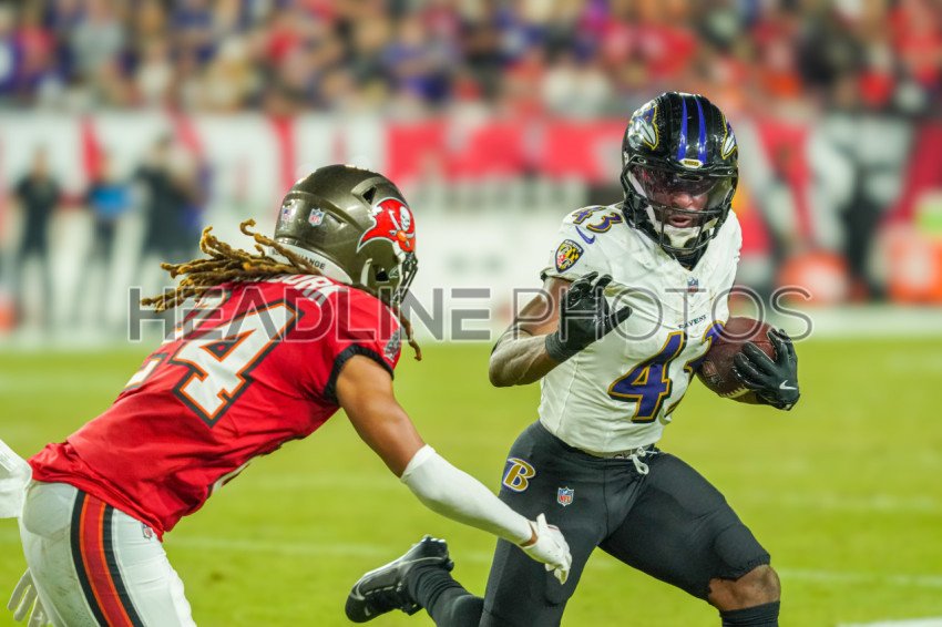 Tampa Bay, Florida, USA, October 21, 2024, Baltimore Ravens runnigback Justice Hill #43 makes a run at Raymond James Stadium. (Photo Credit: Marty Jean-Louis)