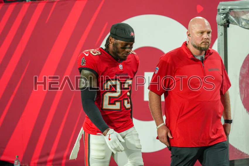 Tampa Bay, Florida, USA, October 21, 2024, Tampa Bay Buccaneers player Tykee Smith #23 leaves the field due to injury at Raymond James Stadium. (Photo Credit: Marty Jean-Louis)