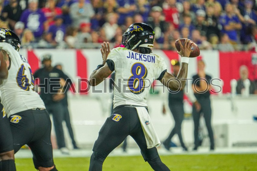 Tampa Bay, Florida, USA, October 21, 2024, Baltimore Ravens quarterback Lamar Jackson #8 makes a pass at Raymond James Stadium. (Photo Credit: Marty Jean-Louis)