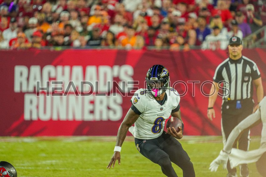 Tampa Bay, Florida, USA, October 21, 2024, Baltimore Ravens quarterback Lamar Jackson #8 makes a run at Raymond James Stadium. (Photo Credit: Marty Jean-Louis)