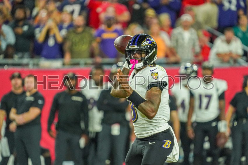 Tampa Bay, Florida, USA, October 21, 2024, Baltimore Ravens quarterback Lamar Jackson #8 readies to make a pass at Raymond James Stadium. (Photo Credit: Marty Jean-Louis)