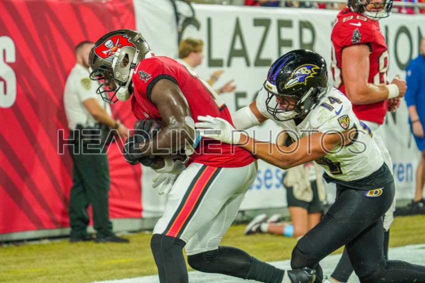 Tampa Bay, Florida, USA, October 21, 2024, Tampa Bay Buccaneers player Rachaad White #1 gets tackled by Kyle Hamilton #14 at Raymond James Stadium. (Photo Credit: Marty Jean-Louis)