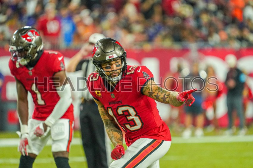 Tampa Bay, Florida, USA, October 21, 2024, Tampa Bay Buccaneers wide receiver Mike Evans #13 points to teammate at Raymond James Stadium. (Photo Credit: Marty Jean-Louis)