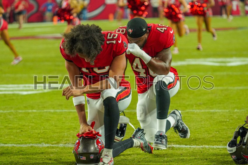 Tampa Bay, Florida, USA, October 21, 2024, Tampa Bay Buccaneers player Jalen McMillan #15 and Antonio Grier Jr #48 praying before the game at Raymond James Stadium. (Photo Credit: Marty Jean-Louis)