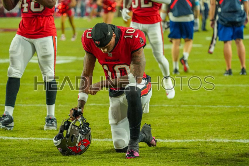 Tampa Bay, Florida, USA, October 21, 2024, Tampa Bay Buccaneers player Trey Palmer #10 kneel to pray before the game at Raymond James Stadium. (Photo Credit: Marty Jean-Louis)