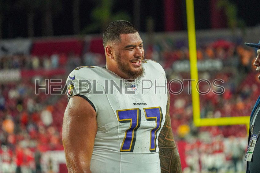 Tampa Bay, Florida, USA, October 21, 2024, Baltimore Ravens player Daniel Faalele #77 at Raymond James Stadium. (Photo Credit: Marty Jean-Louis)