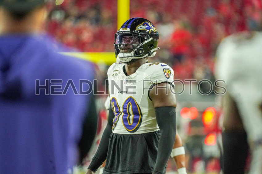 Tampa Bay, Florida, USA, October 21, 2024, Baltimore Ravens player David Ojabo #90 at Raymond James Stadium. (Photo Credit: Marty Jean-Louis)