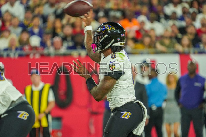 Tampa Bay, Florida, USA, October 21, 2024, Baltimore Ravens quarterback Lamar Jackson #8 makes a pass at Raymond James Stadium. (Photo Credit: Marty Jean-Louis)