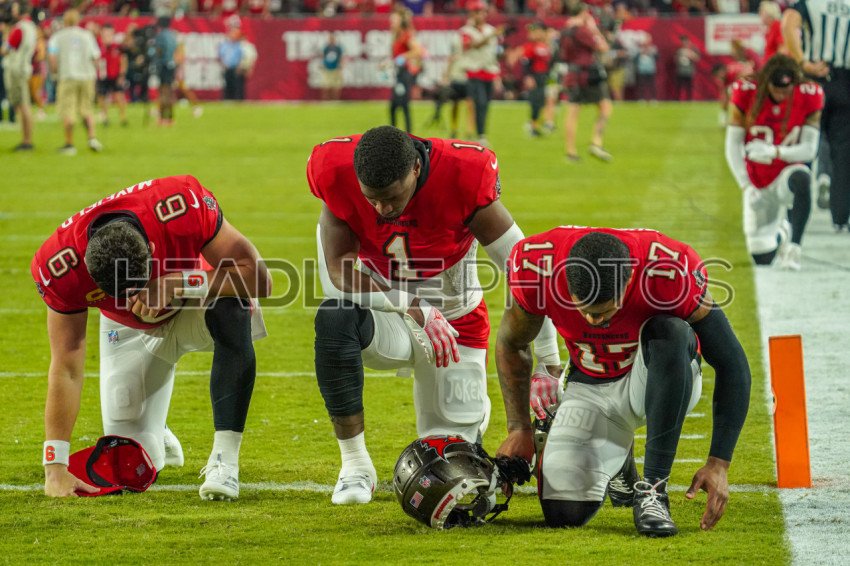 Tampa Bay, Florida, USA, October 21, 2024, Tampa Bay Buccaneers players Baker Mayfield #6, Rachaad White #1 and Sterling Shepard #17 praying before the game at Raymond James Stadium. (Photo Credit: Marty Jean-Louis)