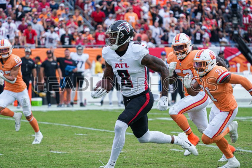 Tampa Bay, Florida, USA, October 27, 2024, Atlanta Falcons tight end Kyle Pitts #8 makes a touchdown at Raymond James Stadium. (Photo Credit: Marty Jean-Louis)