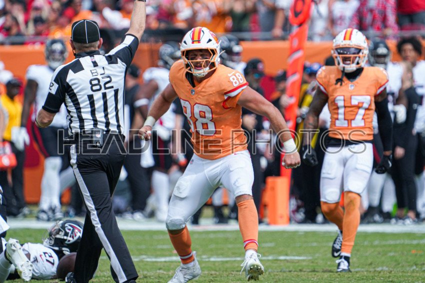 Tampa Bay, Florida, USA, October 27, 2024, Tampa Bay Buccaneers Tight End Cade Otton #88 celebrate after making a play at Raymond James Stadium. (Photo Credit: Marty Jean-Louis)
